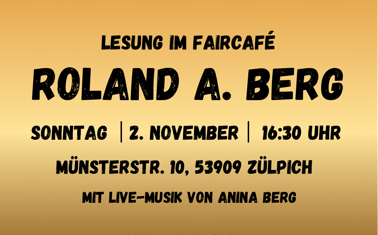 Am frühen Sonntagabend finden im Faircafé in Zülpich neben den Texten von Roland A. Berg auch Live-Musik mit Anna Berg statt. Die Texte aus dem Werk „Lebendigkeit meiner Poesie” entführen das Publikum auf eine Reise durch die Gedanken des Autors. Die Lesung beginnt um 16:30 Uhr.