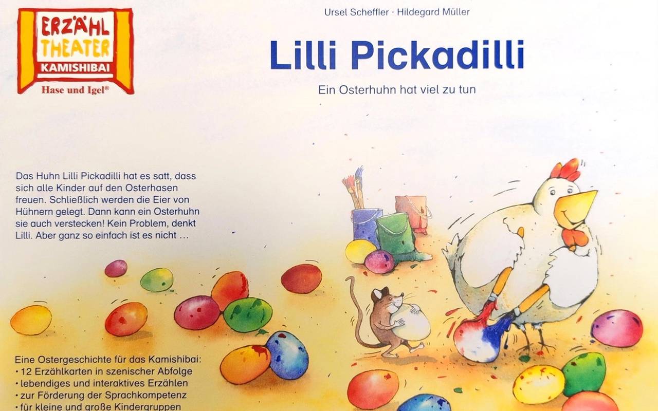 Gezeigt wird ein Kamishibai. Das ist ein aus Japan stammendes Papiertheater, bei dem passende Bilder zur Geschichte gezeigt werden. Dieses trägt den Titel „Lilli Pickadilli – Ein Osterhuhn hat viel zu tun“ von Ursel Scheffler.