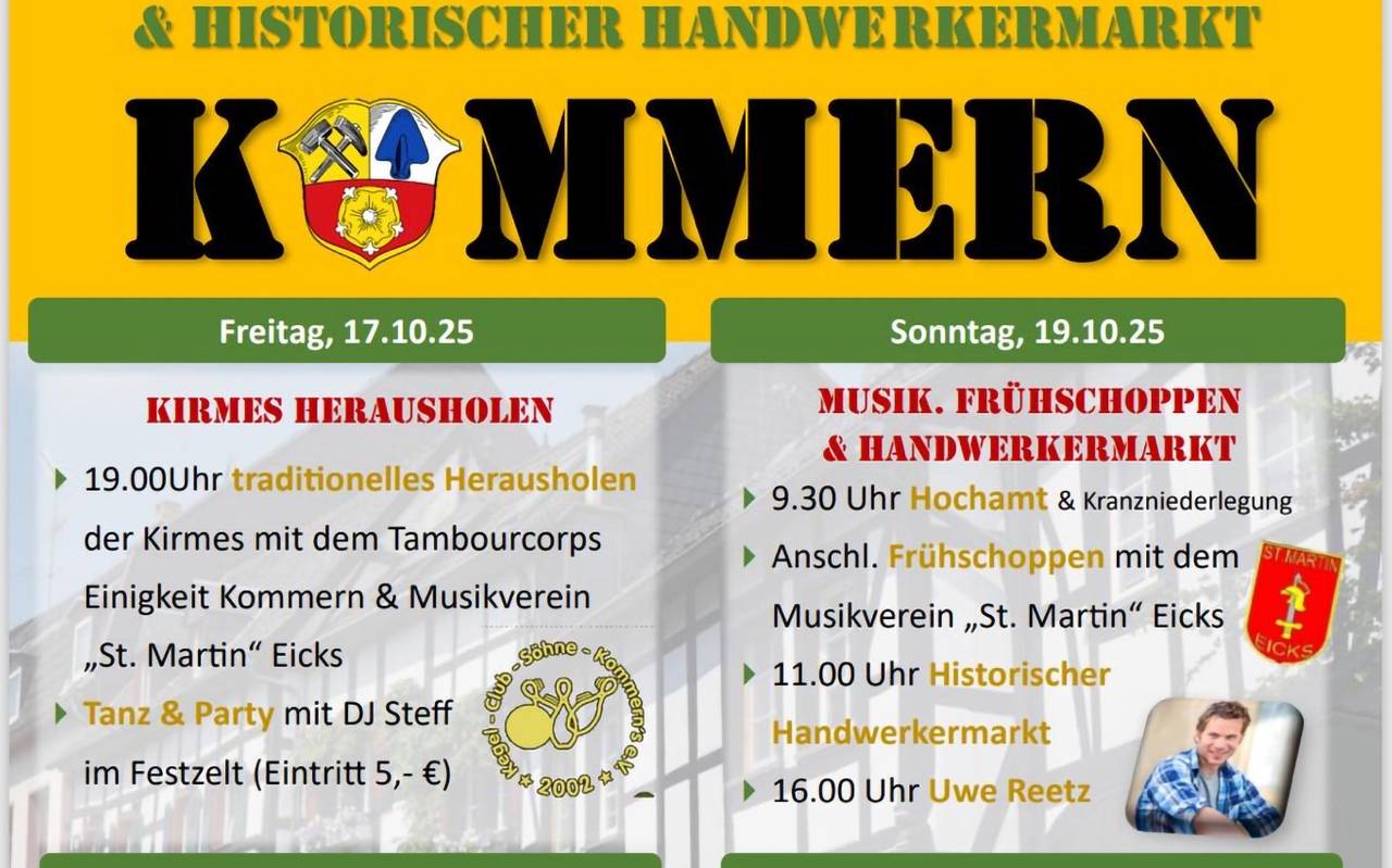 Mit mehr als 85 Ausstellern, Vorführungen alten Handwerks und zahlreichen Foodtrucks bildet der historische Handwerkermarkt das Herzstück des großen Festwochenendes in Kommern. Die Kommerner Kirmes bietet an den vier Tagen des großen Festwochenendes außerdem noch einiges an Party und Live-Musik. Egal, ob Handwerkskunst, kulinarische Spezialitäten, Musik oder Kirmesparty – in Kommern steht ein kunterbuntes Wochenende bevor.