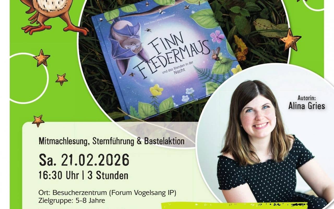 Am Samstag findet im Nationalpark Eifel eine "Expedition durch die Nacht" für Kinder statt. Zuerst liest die Autorin Alina Gries aus ihrem Buch "Finn Fledermaus und das Blenden in der Nacht" vor. Anschließend geht es mit einem SternenGuide auf eine Sternenführung und später kann noch gebastelt werden. Die Veranstaltung dauert ca. drei Stunden und richtet sich an Kinder zwischen fünf und acht Jahren.
