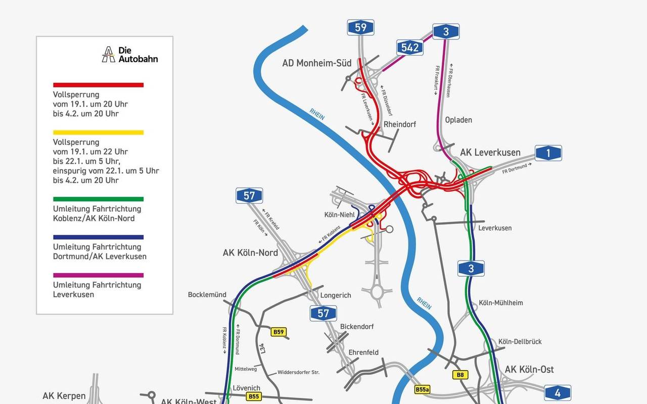 Am besten wäre aber, wenn sie in dieser Zeit –falls möglich- mit der Bahn fahren oder im Homeoffice bleiben. Auf jeden Fall sollten Autofahrer dann nicht durch das Kölner Stadtgebiet fahren, sonst droht hier noch mehr Chaos, sagt der ADAC. Am 4. Februar will die Autobahn GmbH das erste neue Bauwerk an der Leverkusener Brücke offiziell freigeben.