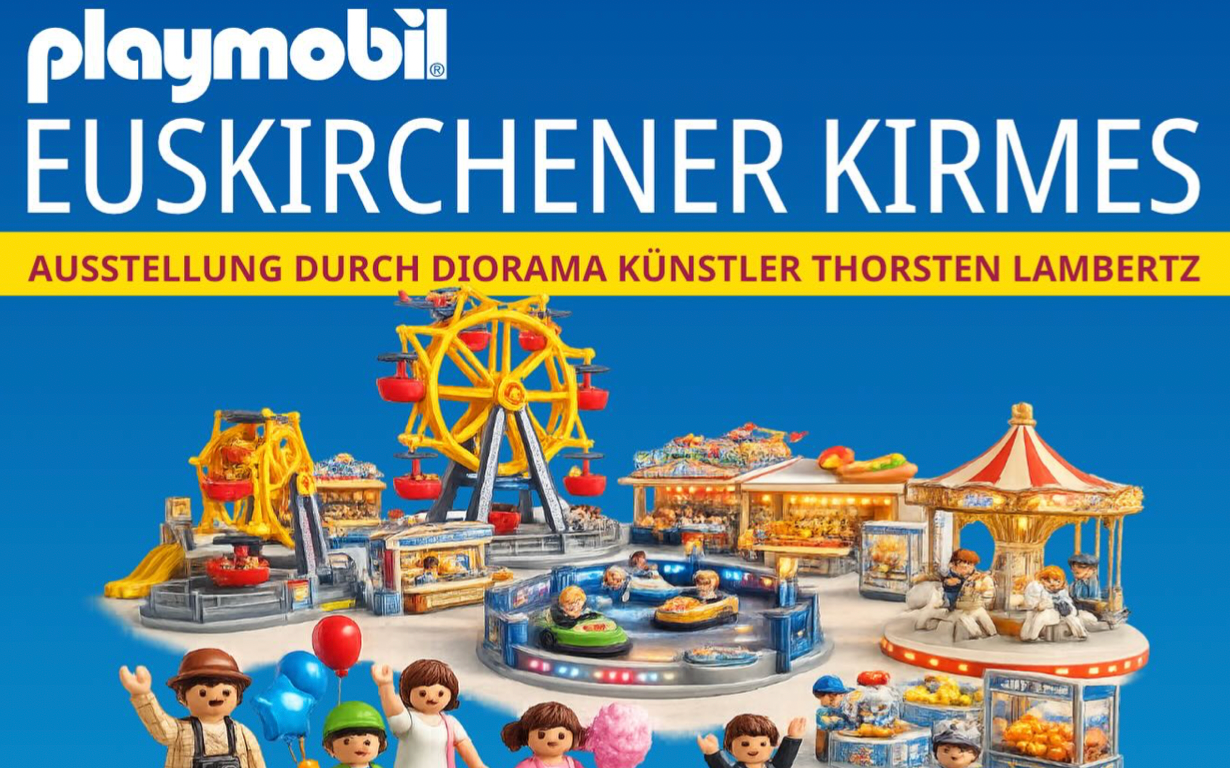 Bei Simons Glück in Euskirchen ist eine besondere PLAYMOBIL-Ausstellung zu sehen. Der Künstler Thorsten Lambertz präsentiert detailreiche Miniaturwelten rund um die Euskirchener Kirmes. Die Vernissage findet am Freitag ab 18:18 Uhr statt.