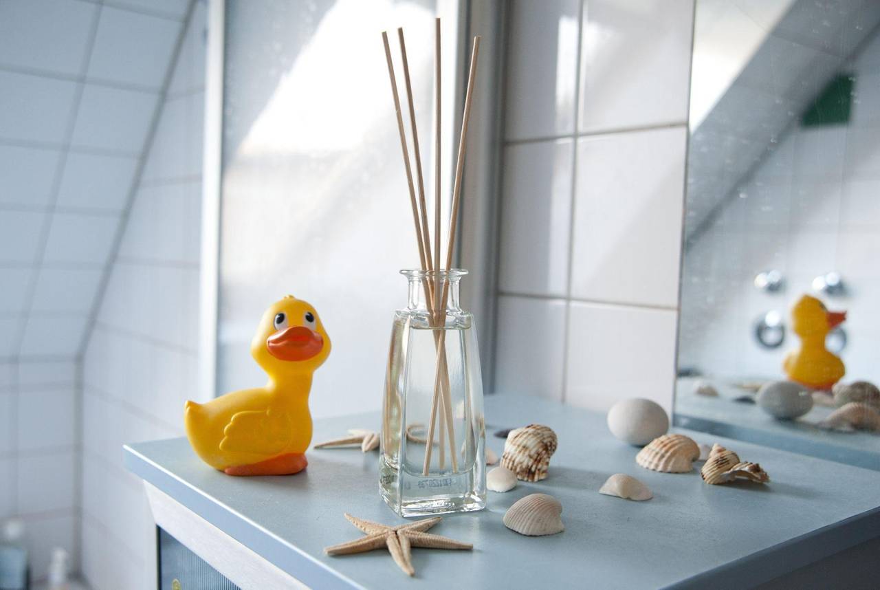 Eine Badeente und Duftmittel in einem Badezimmer