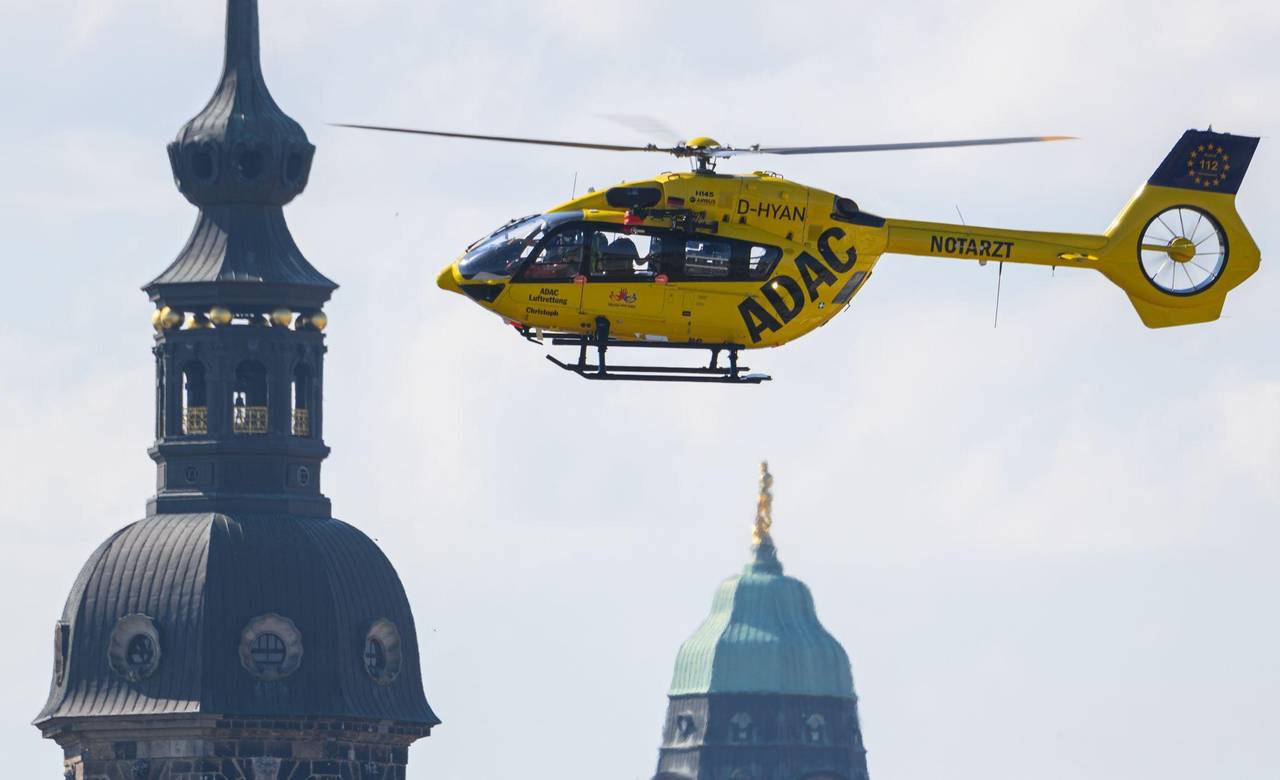 Leistet im Ernstfall schnelle Hilfe aus der Luft: Ein Rettungshubschrauber der ADAC Luftrettung fliegt am Himmel vor der Dresdner Altstadt. (Archivbild)© Robert Michael/dpa
