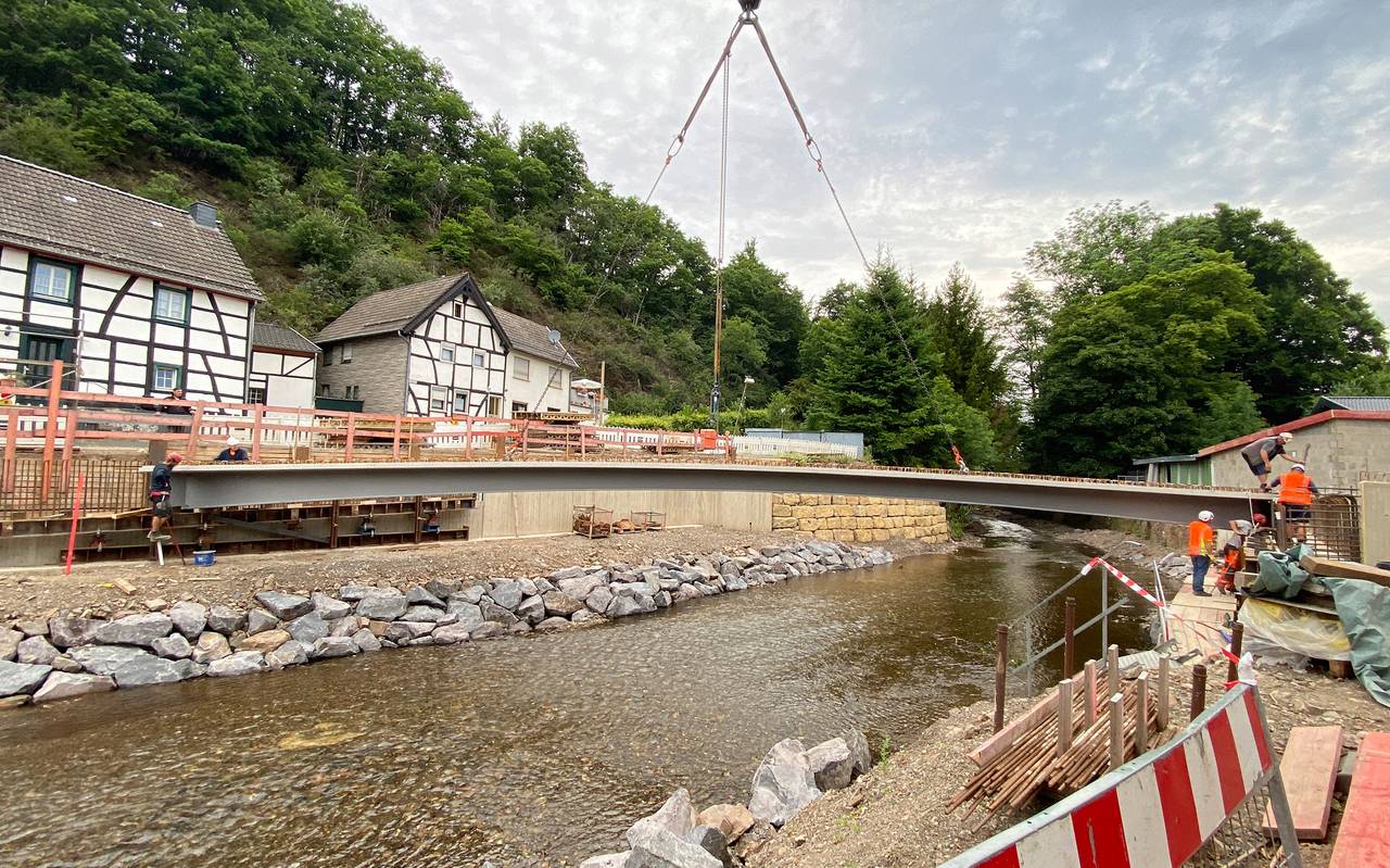 Das bestätigt die Stadt Schleiden. Gestern hat ein 700-Tonnen Mobilkran die neuen Stahlträger für die Brücke eingesetzt. Der Leiter des Schleidener Tiefbauamts, dass der Brückenneubau bis Ende des Jahres noch dauert.