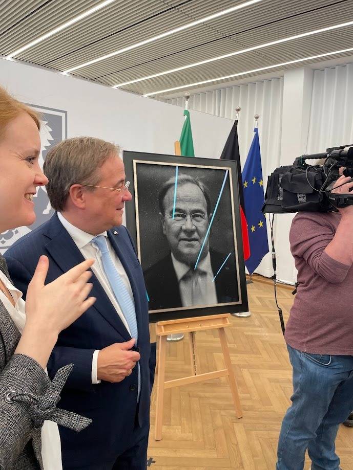 Das Porträt des ehemaligen NRW-Ministerpräsidenten Armin Laschets für die Ahnengalerie wurde enthüllt. Das Design stammt von Künstler Till Brönner.