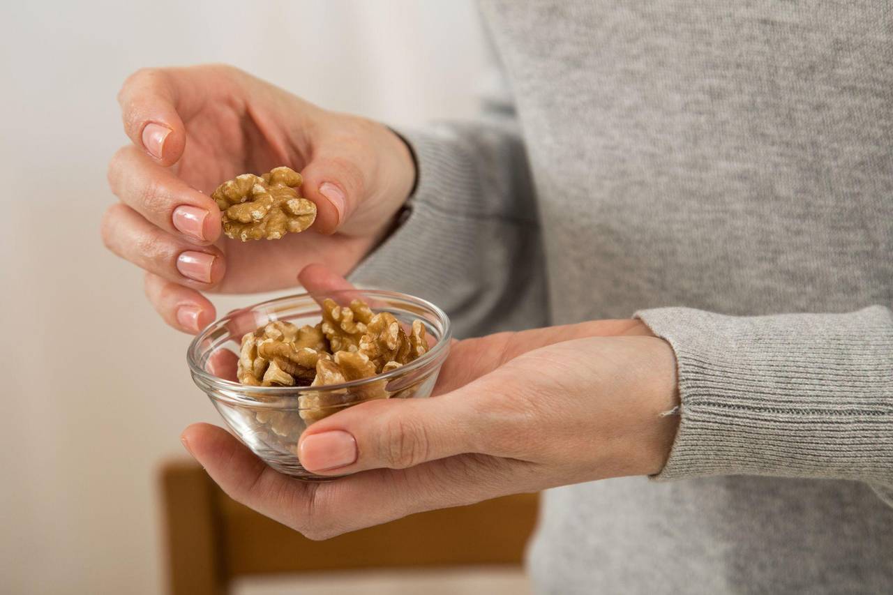 Eine Frau hält ein Schälchen mit Walnüssen in der Hand