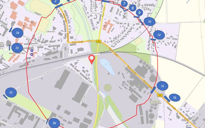 Innerhalb eines Umkreises von 500 Metern um die Zuckerfabrik liegen die Bahnstrecke Euskirchen-Köln/Bonn, die Kreispolizeibehörde Euskirchen, die Bundesstraße nach Rheinbach, sowie die Kölner Straße Richtung Weilerswist und die B51 nach Bad Münstereifel.