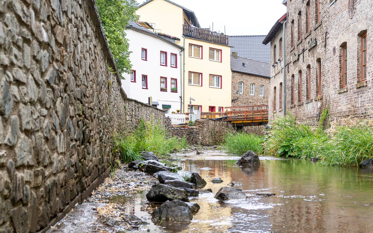 Auch diese Brücke war durch die Flut im Juli 2021 derart beschädigt, dass die Stadt sie abreißen musste. Seitdem kommen Gäste der Restaurants und Bewohner nur über eine Behelfsbrücke an ihr Ziel – davon betroffen ist auch eine Seniorenresidenz.