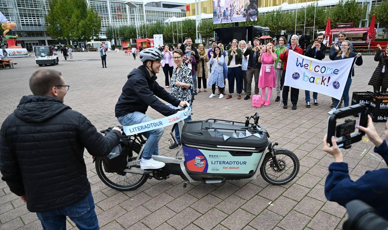 Frankfurt/Main (dpa) - 10.700 Kilometer, sieben Reifenpannen und zwei Unfälle liegen hinter Lennart Schaefer. Aber als der 27-jährige Hamburger mit seinem Lastenrad auf der Frankfurter Buchmesse eintrifft, ist seine wertvolle Fracht unbeschädigt: acht Bücher. Mit ihnen radelte er sieben Monate lang von der Leipziger Buchmesse zur Frankfurter Buchmesse – mit Umwegen durch alle 16 Bundesländer, wo er in Buchhandlungen und Schulen Station machte.
