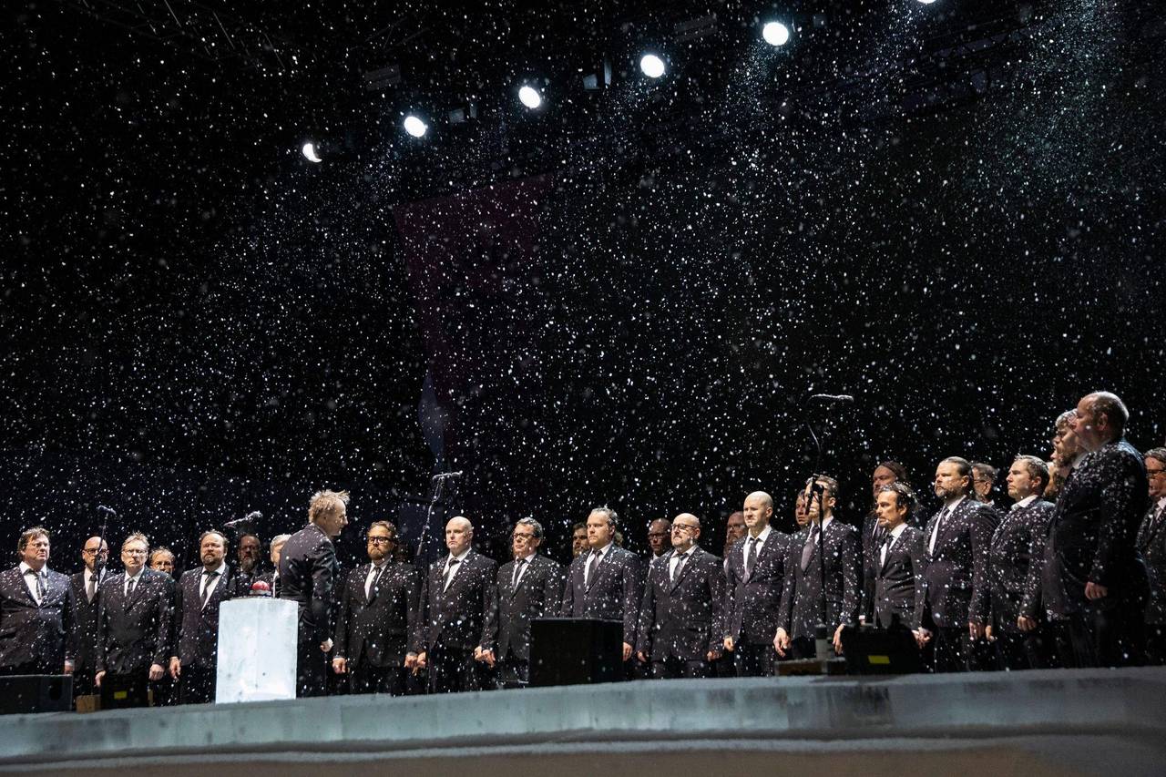 Der schreiende Männerchor singt auf der verschneiten Hauptbühne in Oulu.© Eeva Riihelä/Lehtikuva/dpa