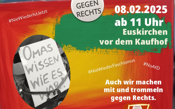 Die Omas gegen Rechts Euskirchen sind von 11 bis 13 Uhr mit einem Infostand vor dem Kaufhof. Ab 12.30 Uhr ist ein Marsch durch die Fußgängerzone mit Trommeln und Flyern geplant. Jeder könne sich dem Marsch anschließen, sagt eine Sprecherin der Omas gegen Rechts. Da es sich aber nicht um eine Großdemonstration handele, sei die Fußgängerzone in dieser Zeit trotzdem nutzbar, erklärt die Sprecherin.
