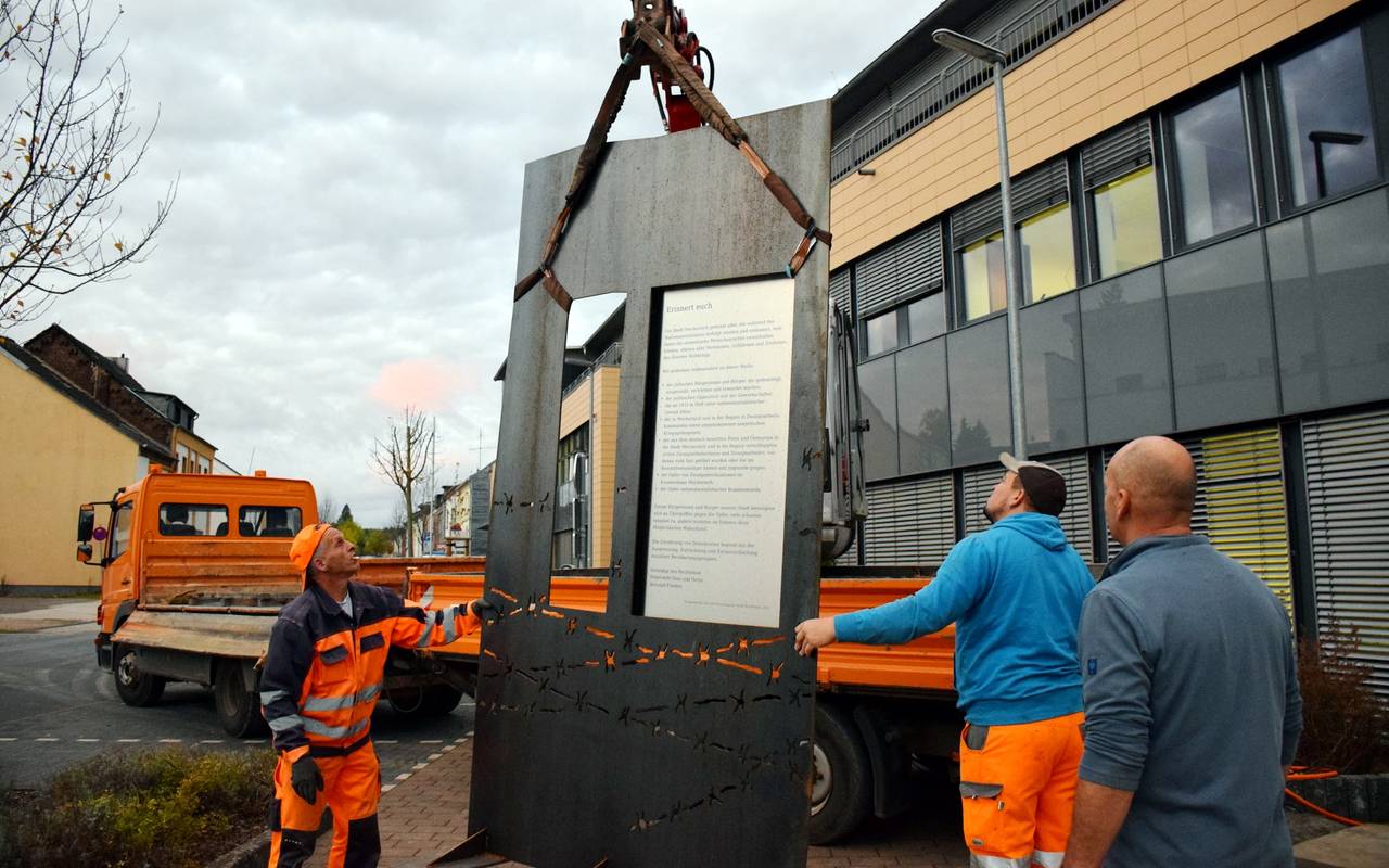 Die Botschaft der Stele lautet „Erinnert euch“. Sie ist 2,60 Meter hoch, aus rostendem Stahl. Ein Fenster bringt Licht in die sonst undurchlässige Stahlwand. Ein Spalt der Hoffnung, der übrigbleibt, hieß es bei der Vorstellung des Projekts. Ins Rollen gebracht hatte das Projekt der Journalist und Sachbuchautor Franz Albert Heinen, der über Zwangsarbeit von 1939-45 geschrieben hat. Das Vorhaben erinnert laut Stadt auch erstmals in der Eifel an die Zwangsarbeiter, die aus den besetzten Ländern im Osten, nach Deutschland verschleppt wurden. 2.700 waren es im früheren Kreis Schleiden. Mit der Stele soll nicht an einzelne Opfergruppen des Naziregimes erinnert werden, sondern an alle, die verfolgt und getötet wurden. Verstreut in Mechernich gibt es einige Gedenkstätten, die aber jeweils an bestimmte Opfergruppen erinnern.