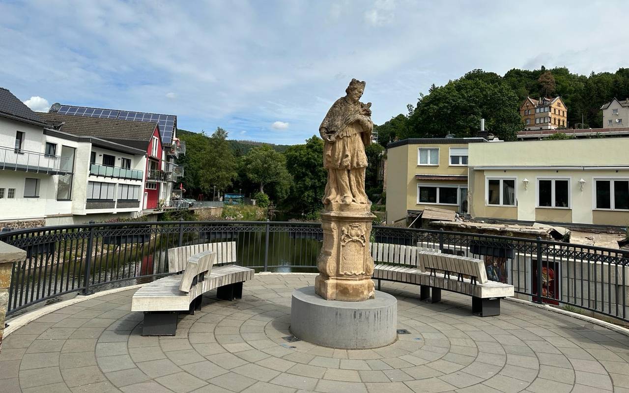 Die Brücke an der Dreiborner Straße führt von der Nepomuk-Statue hinein in die Fußgängerzone. Eigentlich hat die Stadt vorgehabt, sie zu sanieren, jetzt muss sie wahrscheinlich doch neugebaut werden. Das hat uns Schleidens Bürgermeister Pfennings bestätigt.