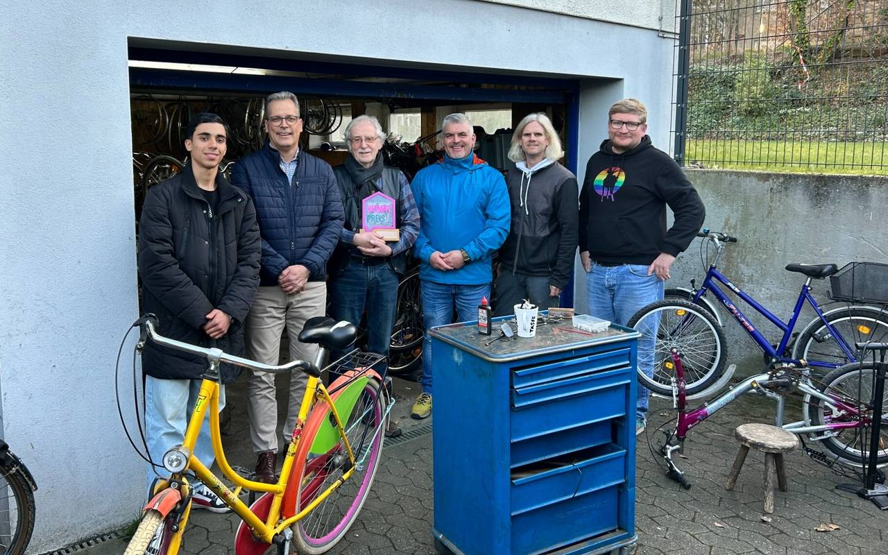 Gewinner des ersten Preises beim „Heimat-Preis 2024“: die Zülpicher Fahrradwerkstatt im evangelischen Jugendheim. Das Foto zeigt (v.l.) Arshia Khani, Bürgermeister Ulf Hürtgen, Theo Trösser, Guido Schmitz, Patrick Kisselmann und Pierre Renard.