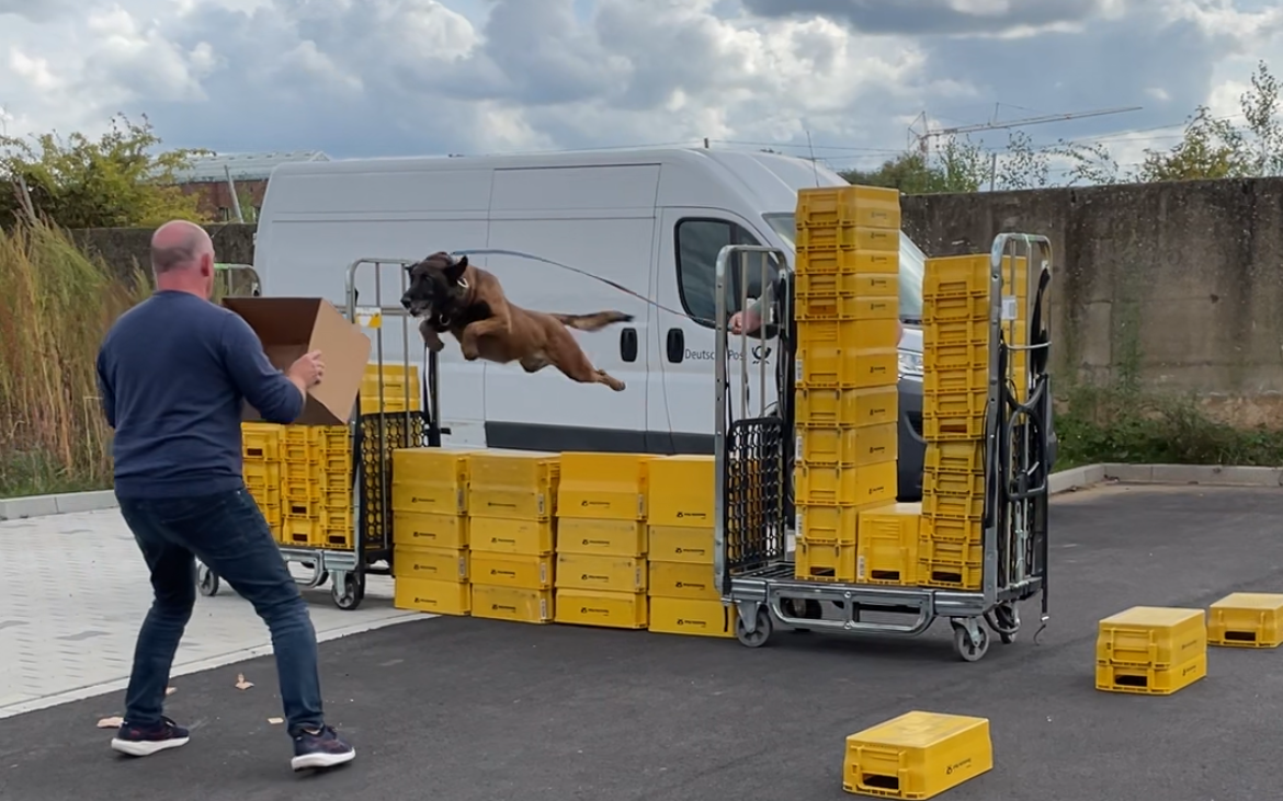 Deshalb bietet die DHL in Euskirchen ihren Zustellern Trainingseinheiten an, wo sie mit ausgebildeten Hunden diese Situationen simulieren können