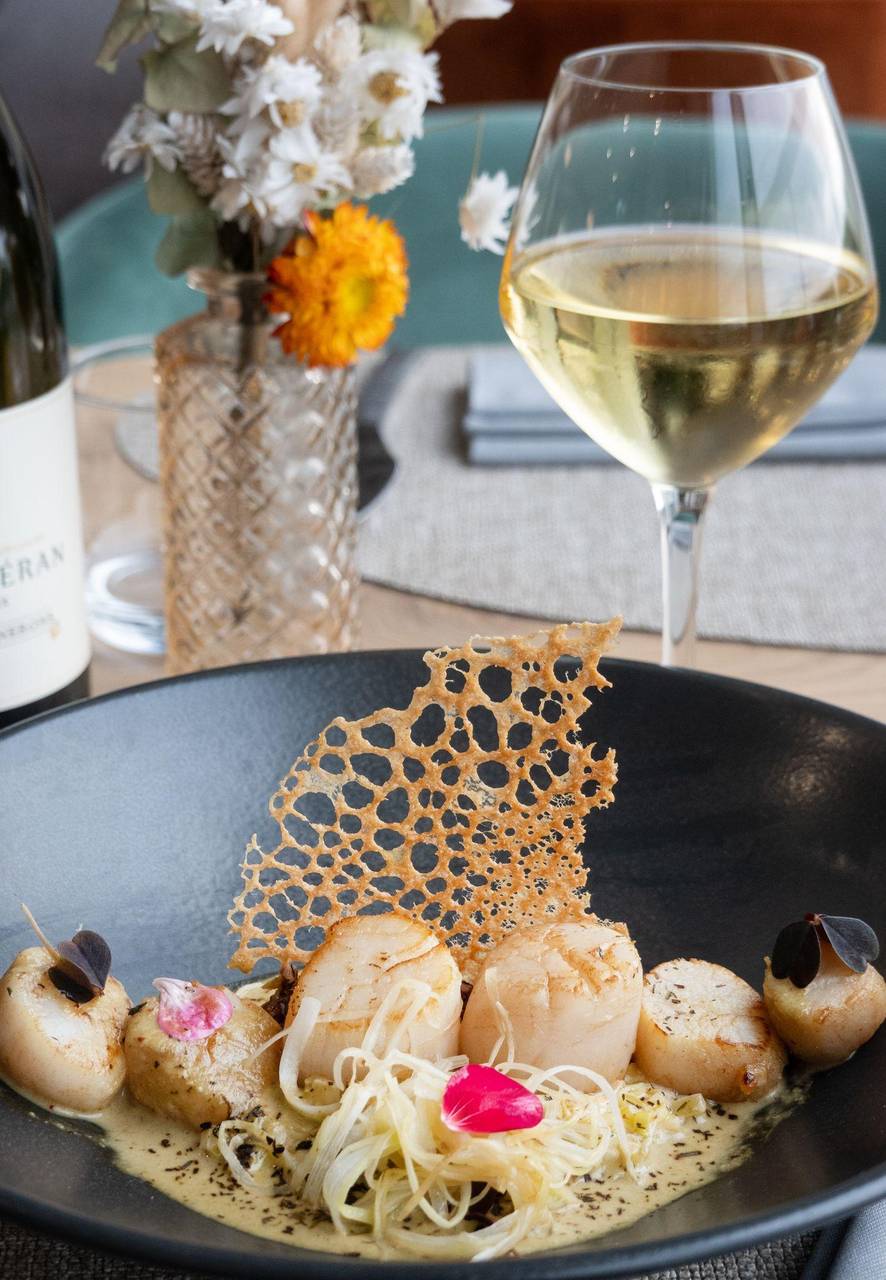 Aurelien Leclerc richtet die Jakobsmuscheln sehr dekorativ mit Lauchgemüse und Quinoa an, empfiehlt dazu einen trockenen Weißwein.