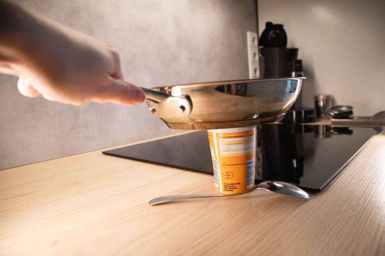 Und so geht's: Pfanne auf dem Herd erhitzen und anschließend auf den Deckel des geöffneten Bechers legen. Zwei Sekunden warten und die Pfanne etwas andrücken. Danach kurz abkühlen lassen.