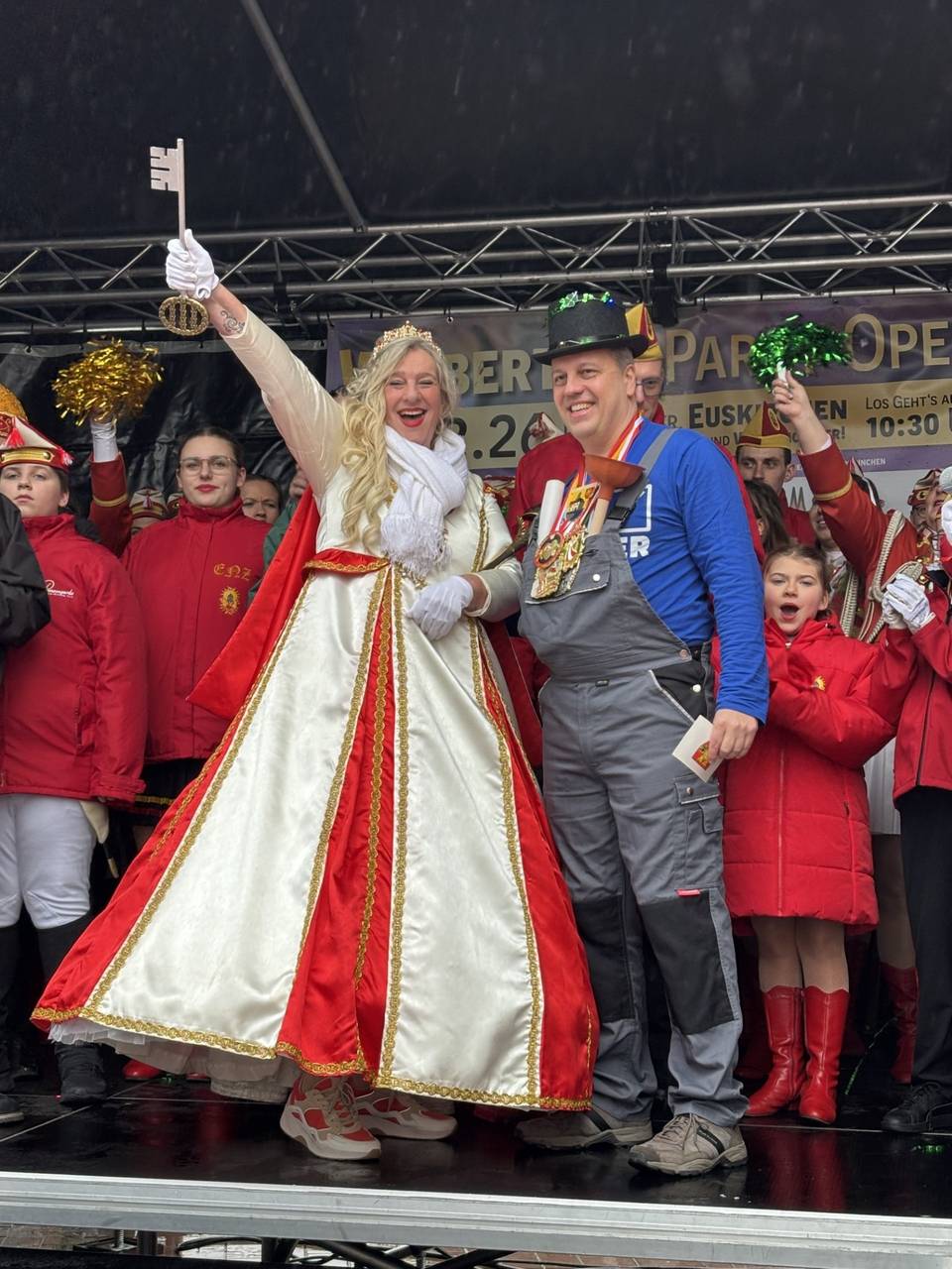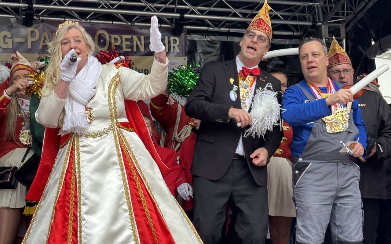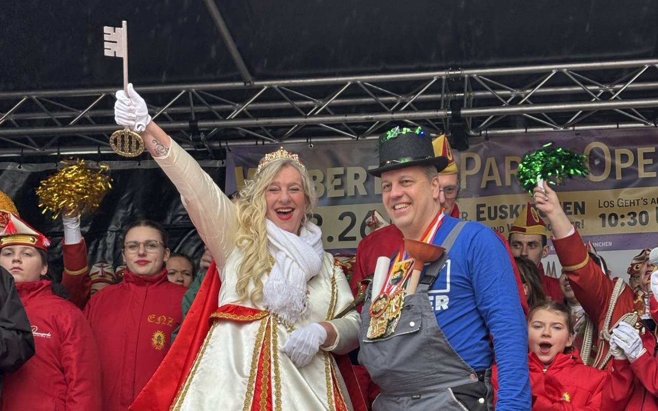 In Euskirchen wurde an Weiberfastnachtsbühne in der Bahnhofstraße gefeiert. Den Rathausschlüssel hat Bürgermeister Sacha Reichelt aber nicht einfach so herausgegeben. Prinzessin Colette I. musste ein paar Sachen aus dem Publikum organisieren. Schnell brachten ihre Adjutanten die gewünschten Dinge: einen Orden, den Schal einer befreundeten KG aus den Euskirchener Ortsteilen, ein Stück Krawatte, ein Stück eines normalen Karnevalskostüms und ein frisch gezapftes Kölsch.