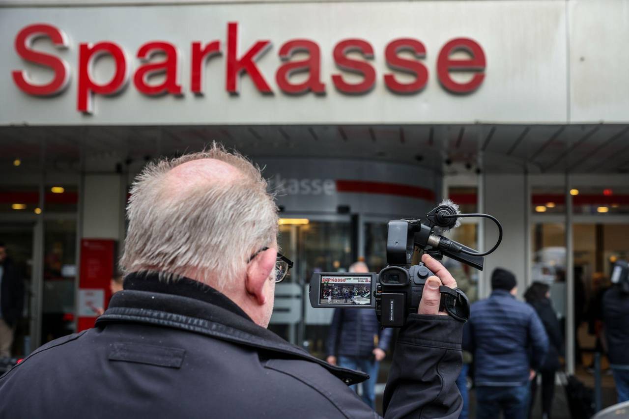 Ein Medienvertreter steht mit einer Kamera vor der Sparkassenfiliale in Buer.© Christoph Reichwein/dpa