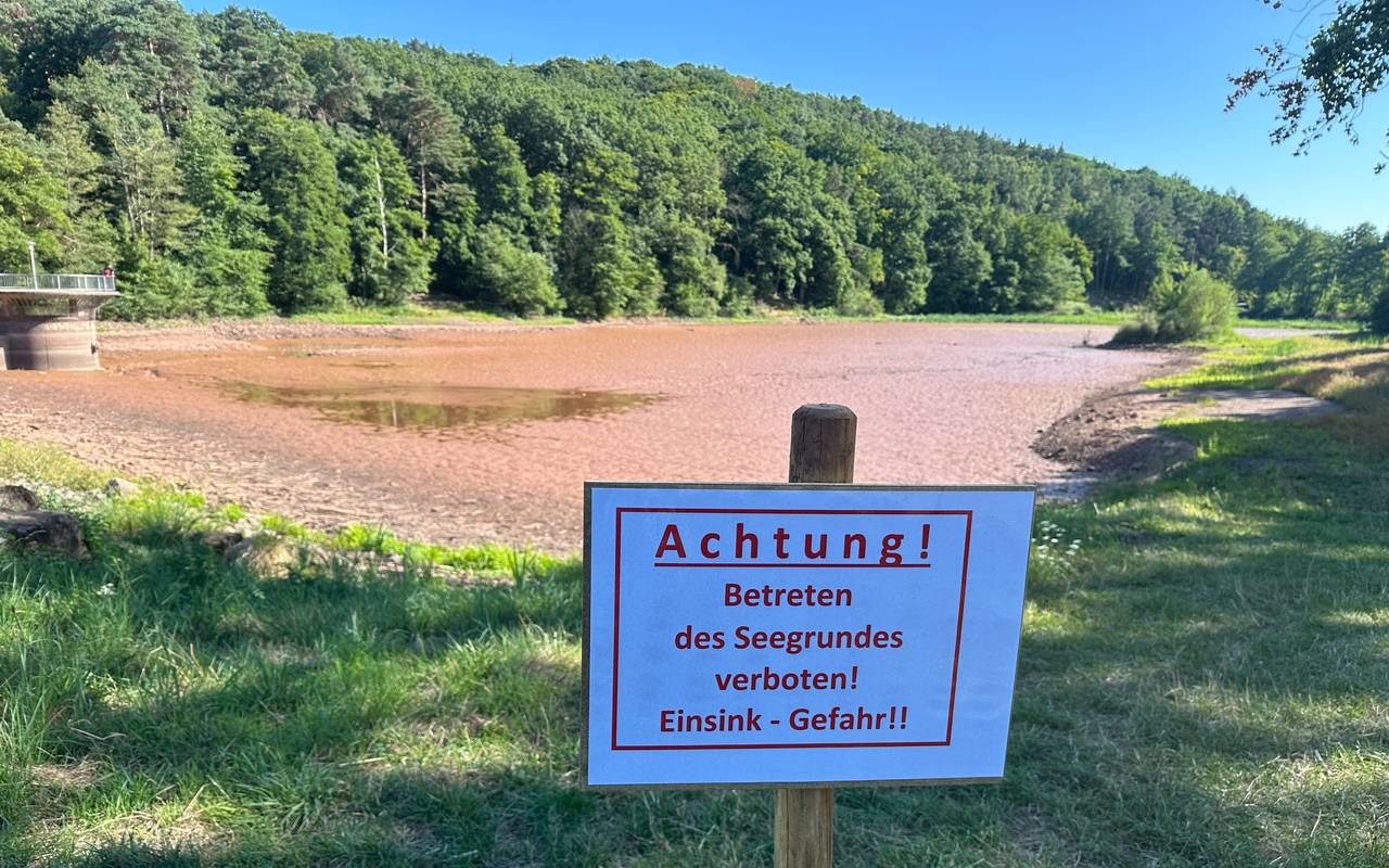 Seit vergangenem Donnerstag ist der Mühlensee in Kommern nahezu leer, nachdem ein defekter Schieber den geplanten Wasserabfluss beschleunigt hat. Die Stadt hat das Gelände abgesperrt, um Unfälle im matschigen Bereich zu verhindern. Hinweisschilder warnen davor, den vermeintlich trockenen See zu betreten, da man sofort im Schlamm einsinken würde.