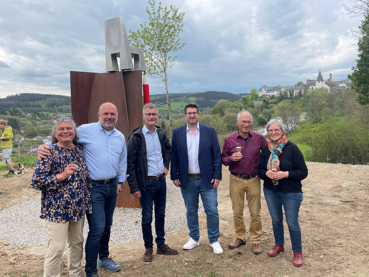 Gestiftet wurde die Skulptur von Hildegard und Peter Igelmund, die seit vier Jahren in Kronenburg zu Hause sind. Der Bürgermeister freute sich bei der Einweihung über das Kunstwerk, es sei eine hochwertige Ergänzung des Kunst- und Kulturangebotes in Dahlem-Kronenburg und ein Blickfang für den Ort.