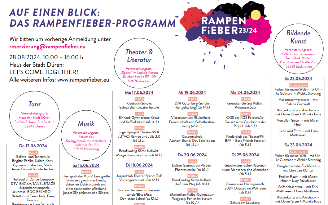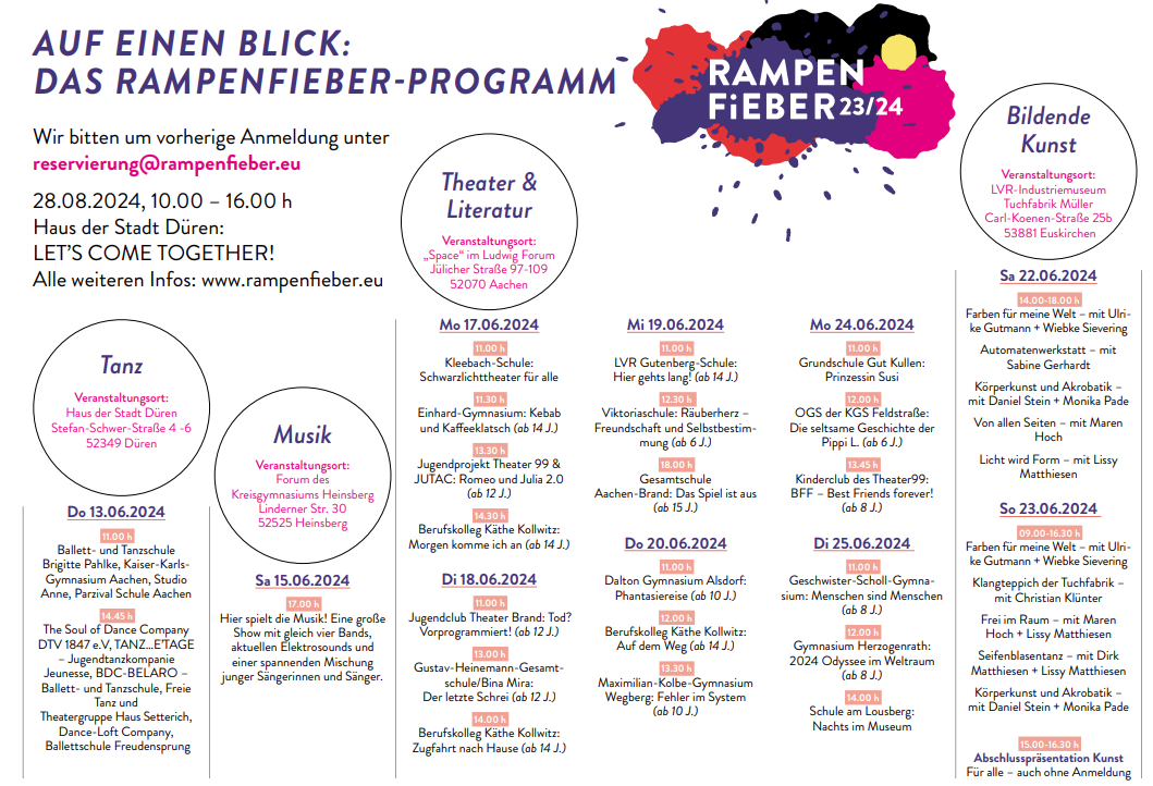 Das Junge Kunstfestival Rampenfieber findet am Wochenende des 22. und 23. Juni im Museum Tuchfabrik Müller in Kuchenheim statt. Kosten entstehen keine und Übernachten ist auf Wunsch möglich. Infos und die Anmeldung gibt es >>> hier <<<