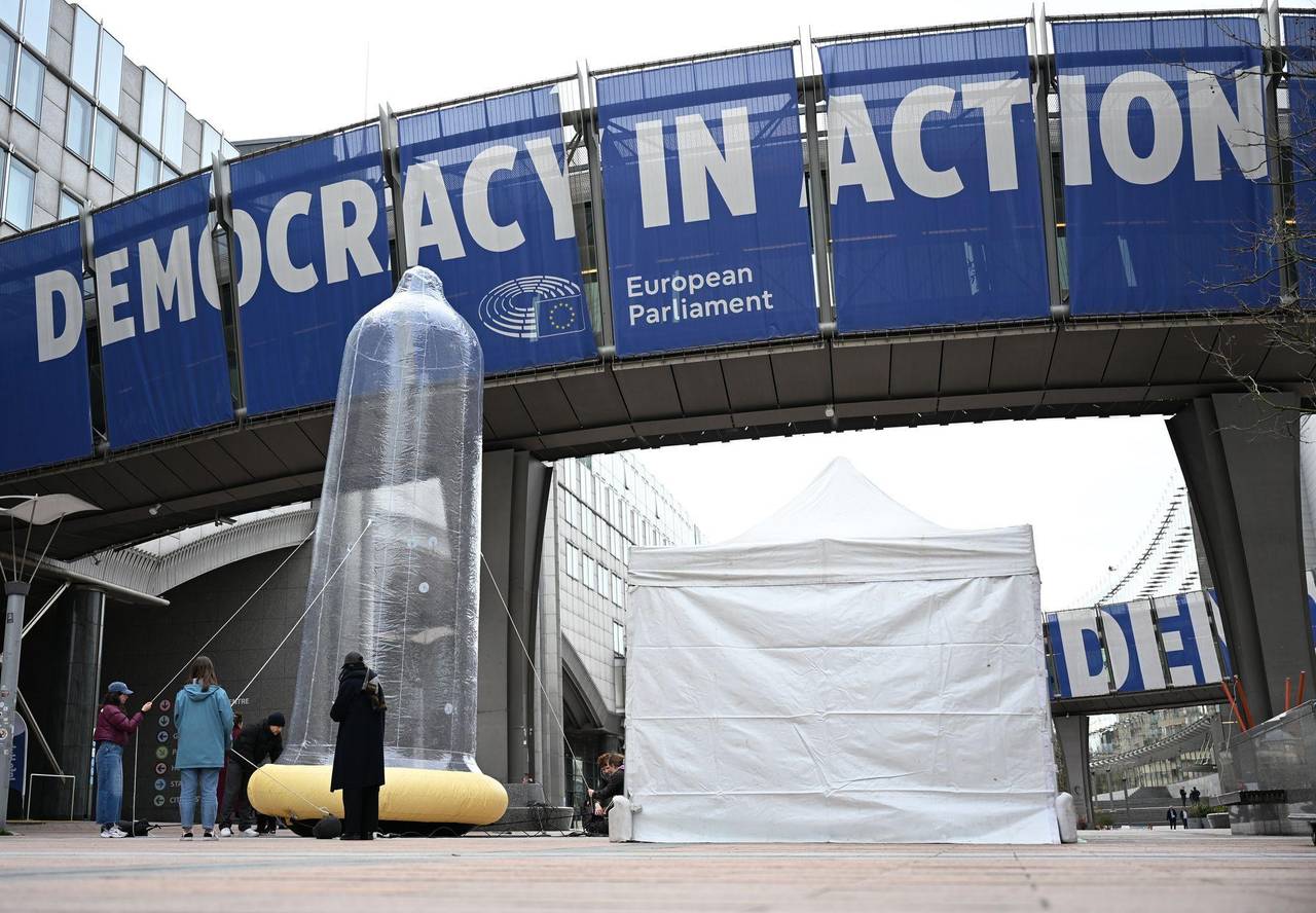 Riesen-Kondom vor EU-Parlament: Mehr zu Verhütung forschen