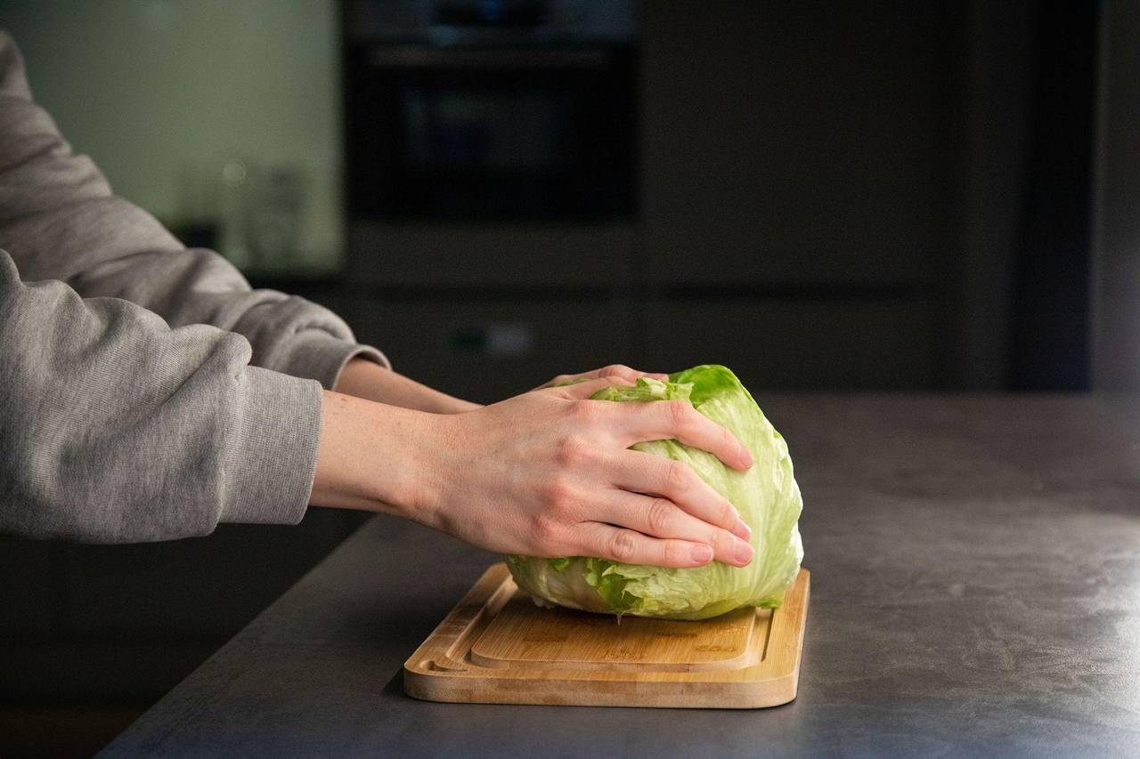 Und so geht's: Den Salatkopf mit dem Strunk nach unten kräftig auf eine feste, glatte Arbeitsfläche oder ein Schneidebrett schlagen. Den Strunk anschließend mit der Hand einfach herausdrehen oder herausziehen.