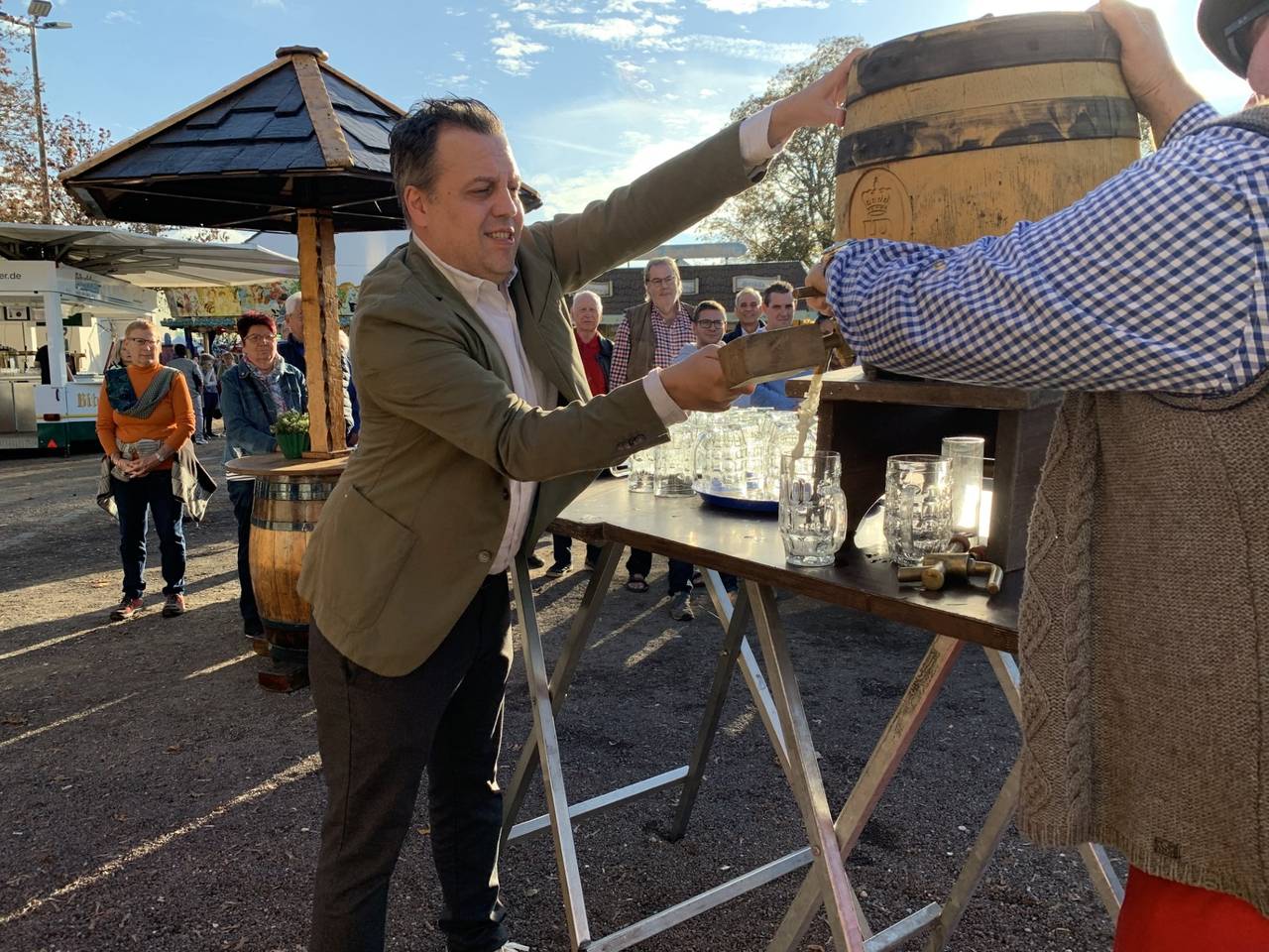 Bürgermeister Sacha Reichelt hat das Fass erfolgreich angestochen und damit am Freitagnachmittag die Kirmes eröffnet.
