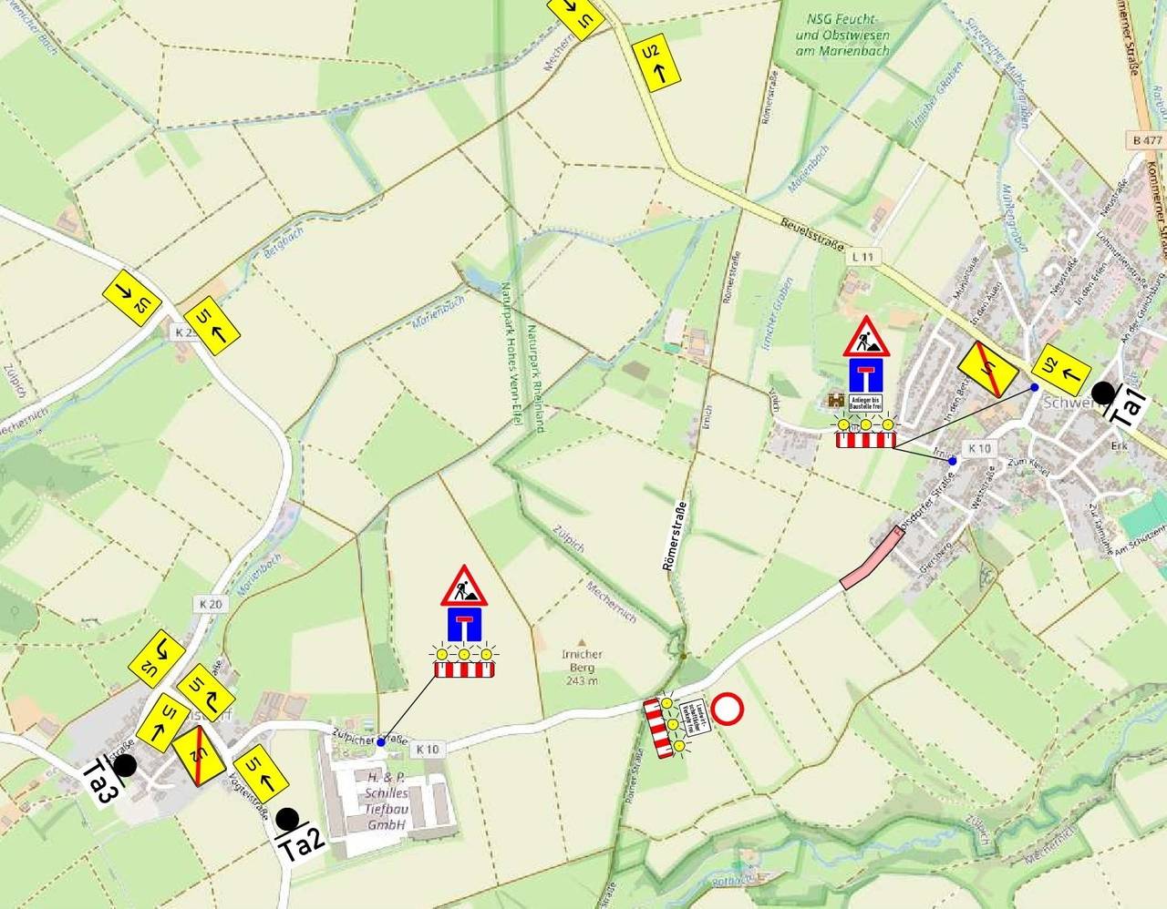 Im Kreis Euskirchen kommt es zu Verkehrseinschränkungen: Die K10 zwischen Schwerfen und Floisdorf wird ab Montag (13. Januar) für etwa drei Wochen gesperrt. Grund für die Sperrung sind notwendige Kanalarbeiten, wie die Stadt Zülpich mitteilte. Durch die Bauarbeiten werden sowohl die Floisdorfer Straße in Schwerfen als auch die Zülpicher Straße in Floisdorf zu Sackgassen. Für die Dauer der Arbeiten wird eine Umleitung eingerichtet. Diese führt über die L11, die Stephanusstraße und die K20, um den Verkehr zwischen Schwerfen und Floisdorf aufrechtzuerhalten. Die Bauarbeiten sollen voraussichtlich am 31. Januar abgeschlossen sein.