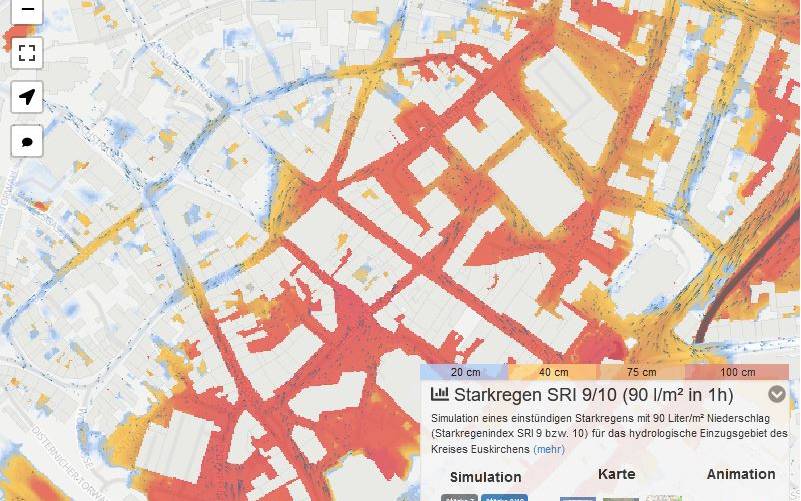 Im Internet können Hausinhaber im Kreis Euskirchen ab sofort nachsehen, ob ihr Haus bei Starkregen gefährdet ist. Denn auch große Regenmengen abseits von Flüssen und Bächen können Gebäude und Grundstücke bedrohen. Die virtuellen Straßenkarten zeigen farblich abgestuft, wie hoch das Wasser in einer Straße steigen kann und welche Fließrichtung es hat.