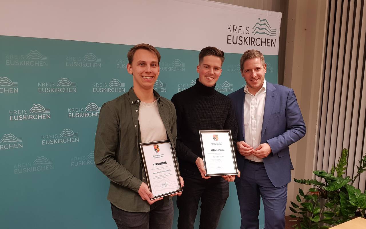 Jeweils 6.000 Euro Förderung für ihre Meisterausbildung sowie eine Urkunde erhielten Tischler Jonas Maternus Schmitz aus Euskirchen und Elektrotechniker David Franz, ebenfalls aus Euskirchen. Beide haben sich mit dem Stipendium verpflichtet, anschließend fünf Jahre im Kreis Euskirchen zu arbeiten. Landrat Markus Ramers weiß, dass zwei Meister nicht das Fachkräfteproblem lösen werden. Er sieht das Stipendium aber als ein Zeichen, dass der Kreis Euskirchen das Handwerk unterstützt und wertschätzt. Wie es mit den Stipendien zukünftig weitergeht, ist noch unklar. Ramers will sich aber für eine Form der Fortsetzung einsetzen.