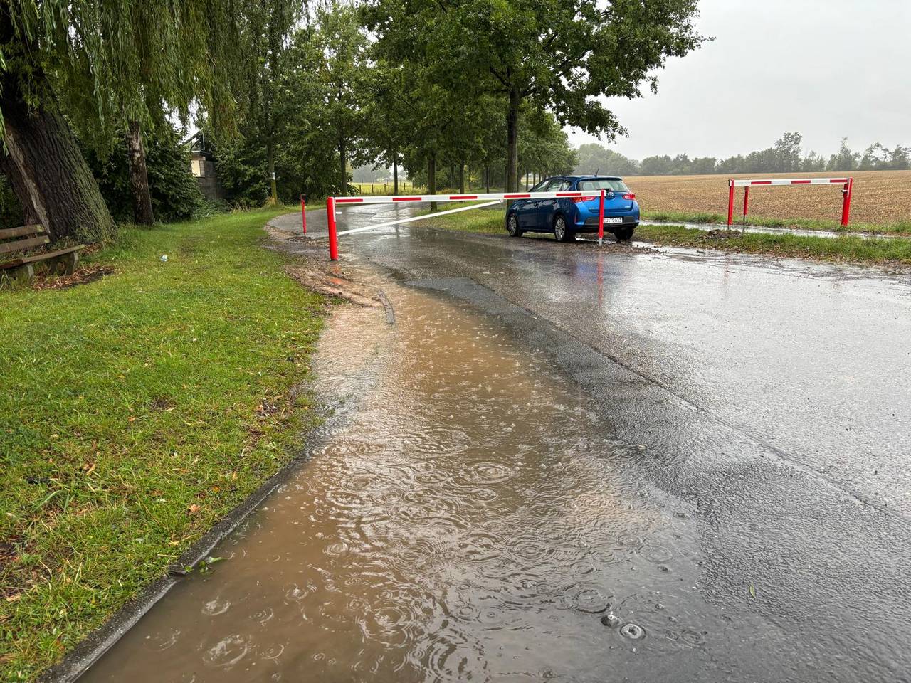 Darüber hinaus musste im Stadtgebiet Zülpich die Straße am Wassersportsee gesperrt werden. Dort ist eine Senke, die für den Bau einer Hochwasserschutzmaßnahme gedacht ist, voll Wasser gelaufen.