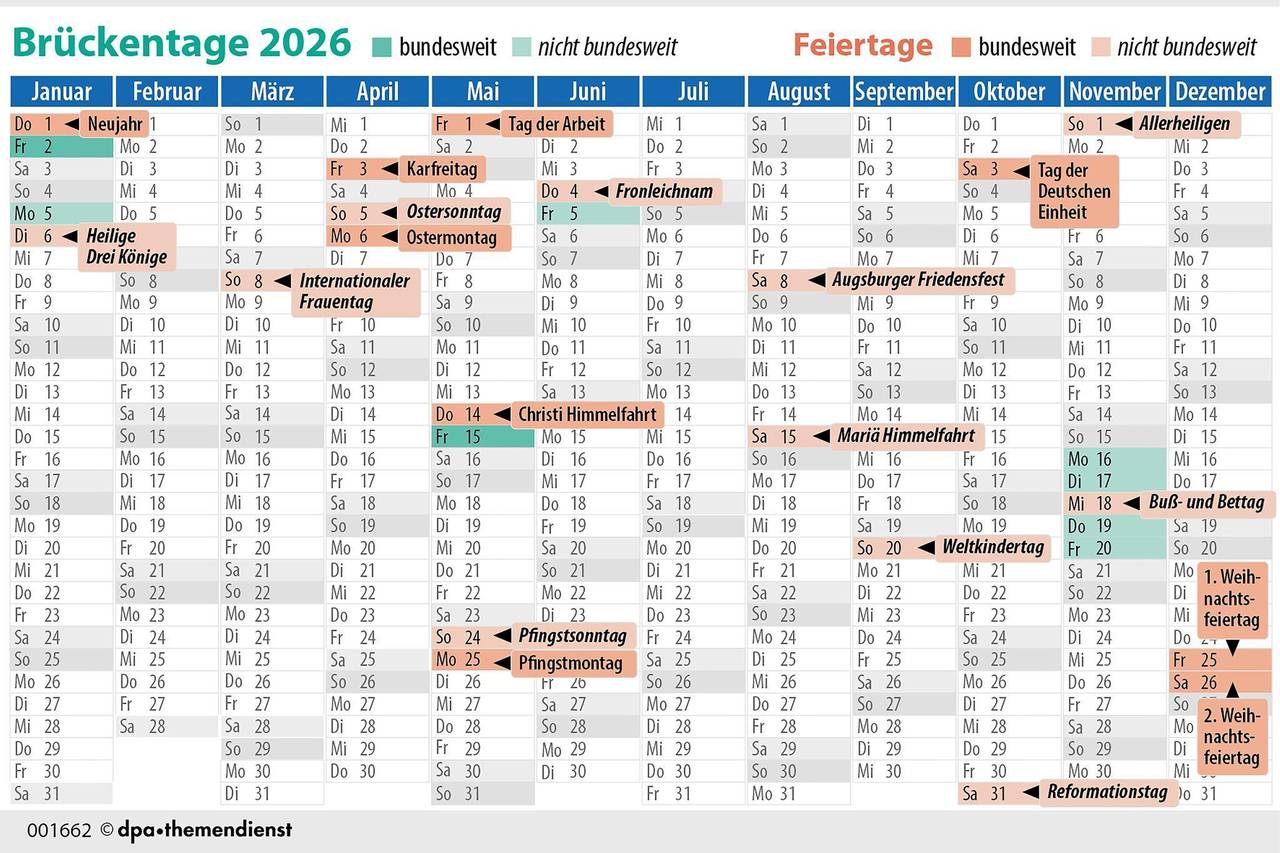 Einige Feiertage fallen in 2026 auf das Wochenende. Doch manche lassen sich mit einem nahen Wochenende zu einer etwas längeren Auszeit verbinden.© dpa-infografik/dpa-tmn