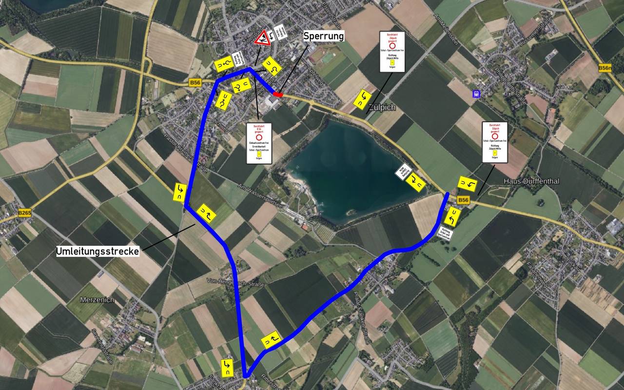 Autofahrer müssen in Zülpich ab Montag (04.08.) einen Umweg in Kauf nehmen. Grund dafür ist eine Vollsperrung der B56. Im Bereich des Kreisverkehrs mit der Bonner Straße ist für Autofahrer voraussichtlich die ganze Woche kein Durchkommen.